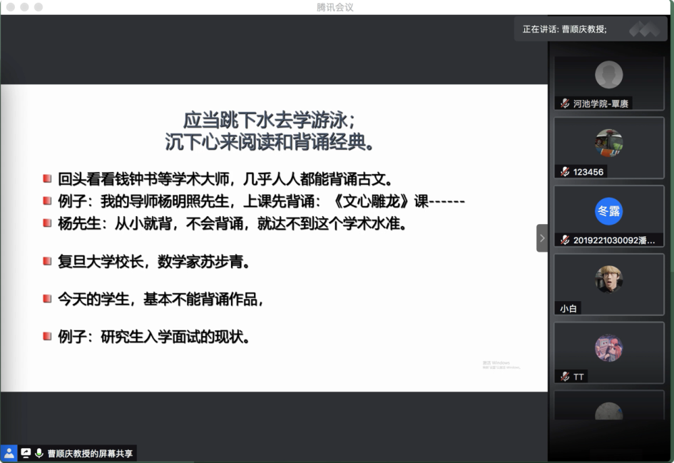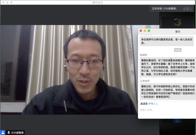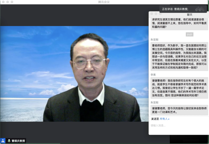 10月16日19:30,“传薪·研究生培养问题与方法系列活动”第一场在腾讯会议平台顺利举行。太阳成tyc33455cc官网杰出教授、太阳成tyc33455cc官网学术院长曹顺庆教授应邀作题为“培养研究生的几点体会”的讲座,太阳成官网副院长胡易容教授担任讲座主持人。